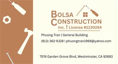 BOLSA CONSTRUCTION, INC LIC#1130264. B -General Building. Professional: Design, Build, Remodel, Repair. L/L Phương Trần...