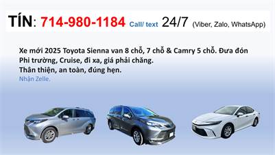 Xe mới 2025 TOYOTA 5-8 chỗ, có carseat+booster. Đưa đón phi trường, đi xa, giá phải chăng (nhận zelle). An toàn, đúng hẹn. TÍN: 714-980-1184