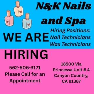 We are seeking four licensed nail technicians, and two licensed wax technicians. Flexible schedules and competitive pay offered. Contact: 562-506-3171; address 18500 via princessa, canyon country, CA 91387.