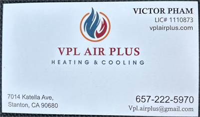 VPL AIR PLUS HEATING & COOLING. LICENSE C20:#1110873. Bonded&Insured. Chuyên lắp đặt, sửa chữa, bảo trì máy lạnh, máy sưởi, mini split. L/L: Thắng 657-222-5970
