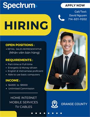 Tuyển nhân viên bán Spectrum Internet, Mobile. Trả commission rất cao. $4,000-$9,000/month. Yêu cầu: 18-30 tuổi, giao tiếp tự tin, lanh lẹ. Location: Westminster, Garden Grove. L/L: David 714-831-9202